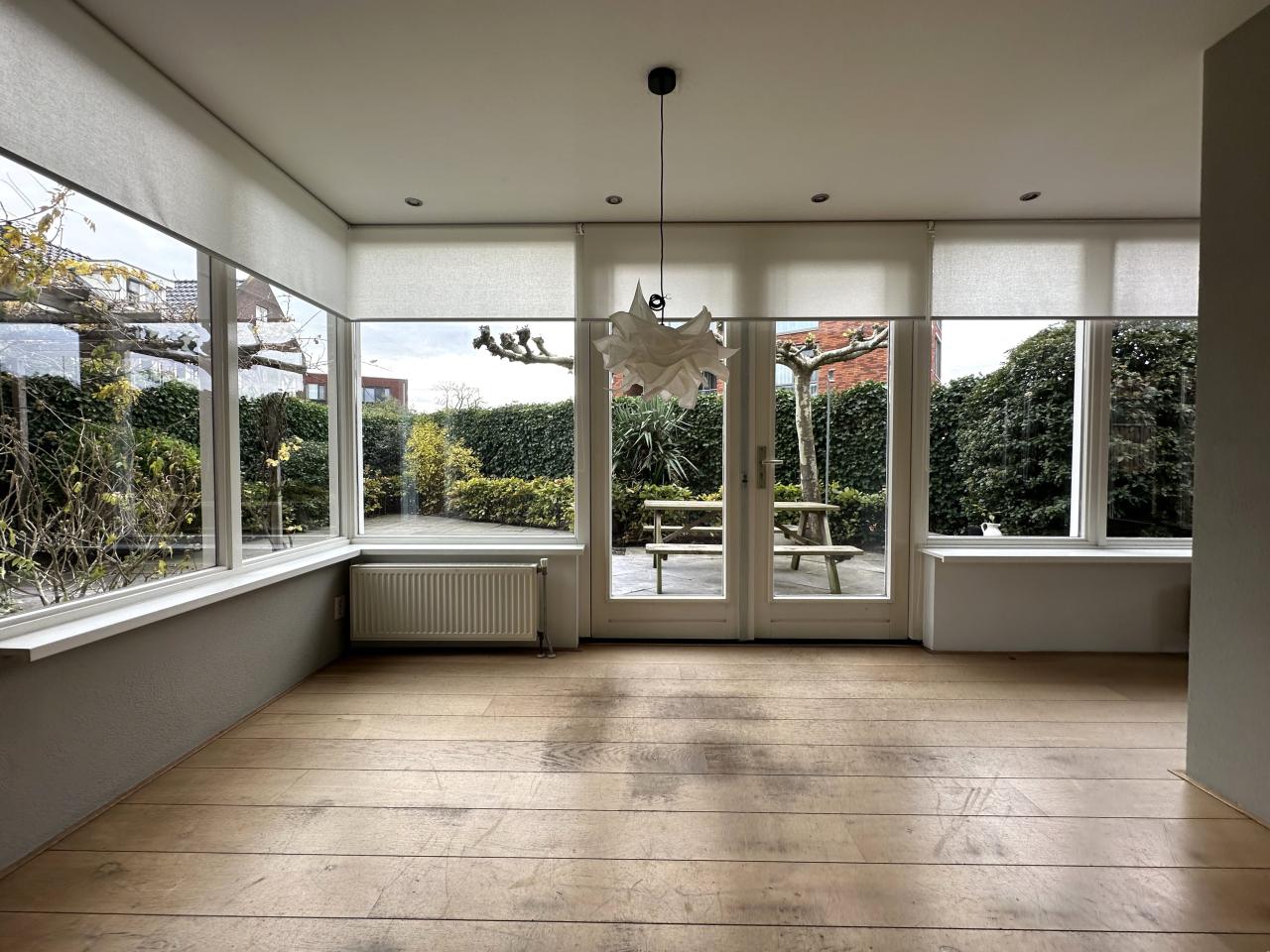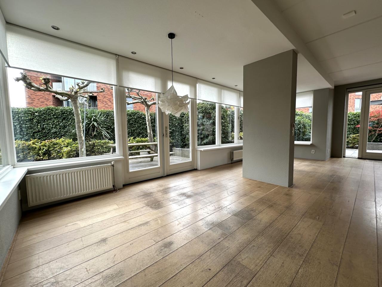 Entree , hal, toilet. De riante en lichte woonkamer heeft aan twee kanten toegang tot de tuin.