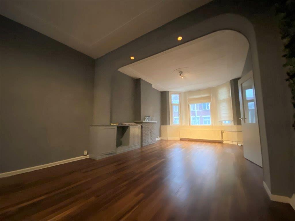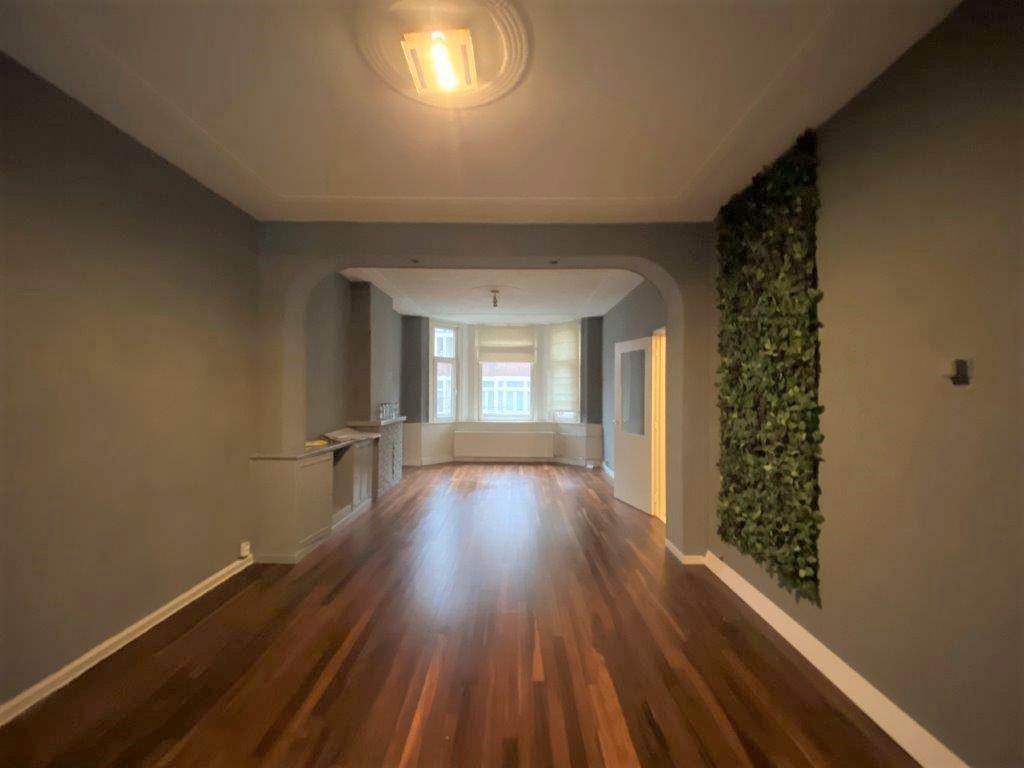 Hal , toilet , riante woonkamer met hoge plafonds met uitzicht over de straat, de slaapkamer is gelegen aan de achterzijde, evenals de keuken. Via de keuken toegang tot het riante dakterras.