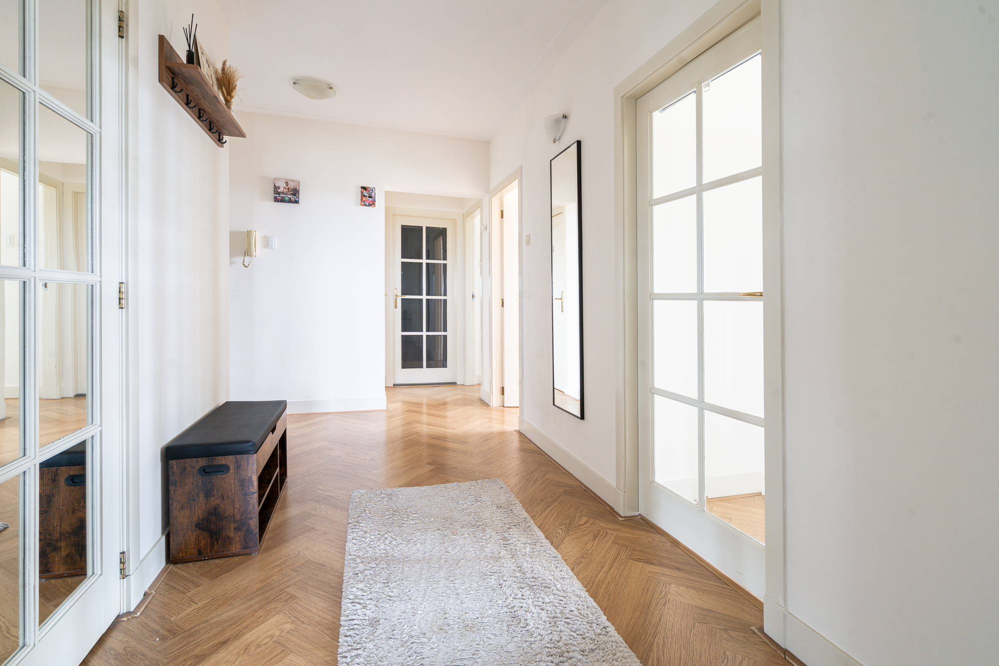 You enter into a wide hallway that provides access to nearly all rooms in the apartment.