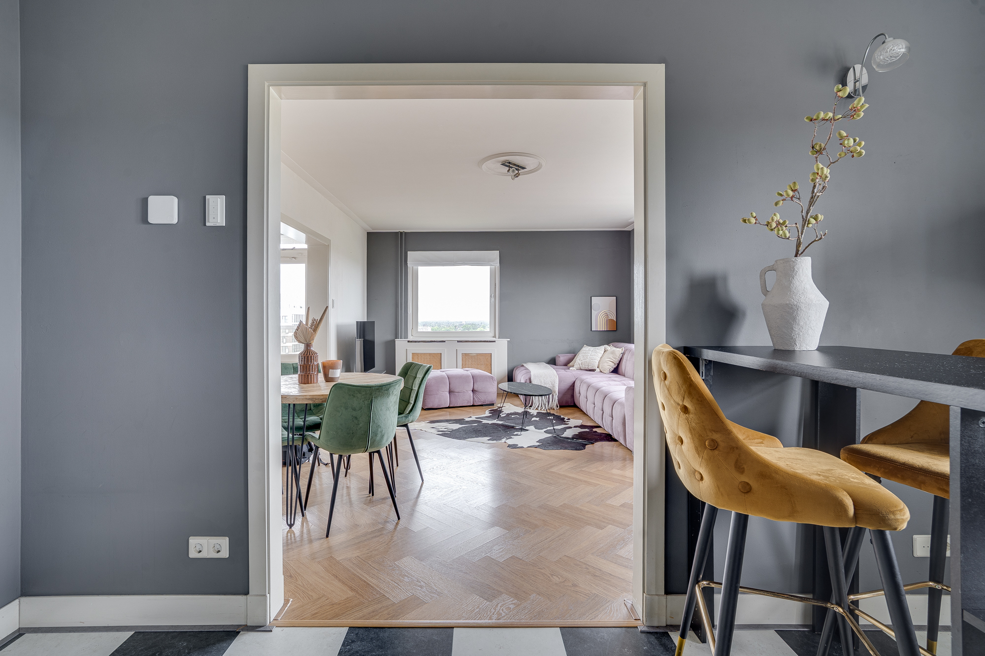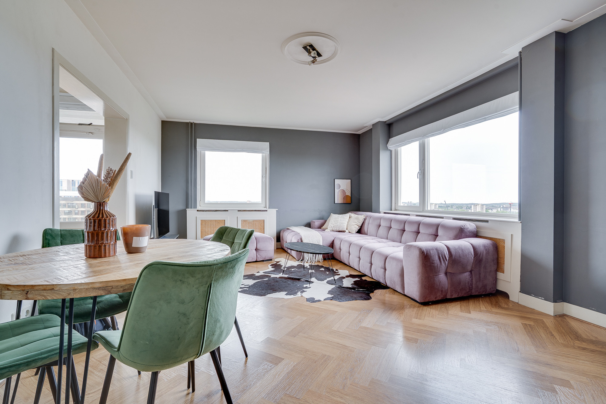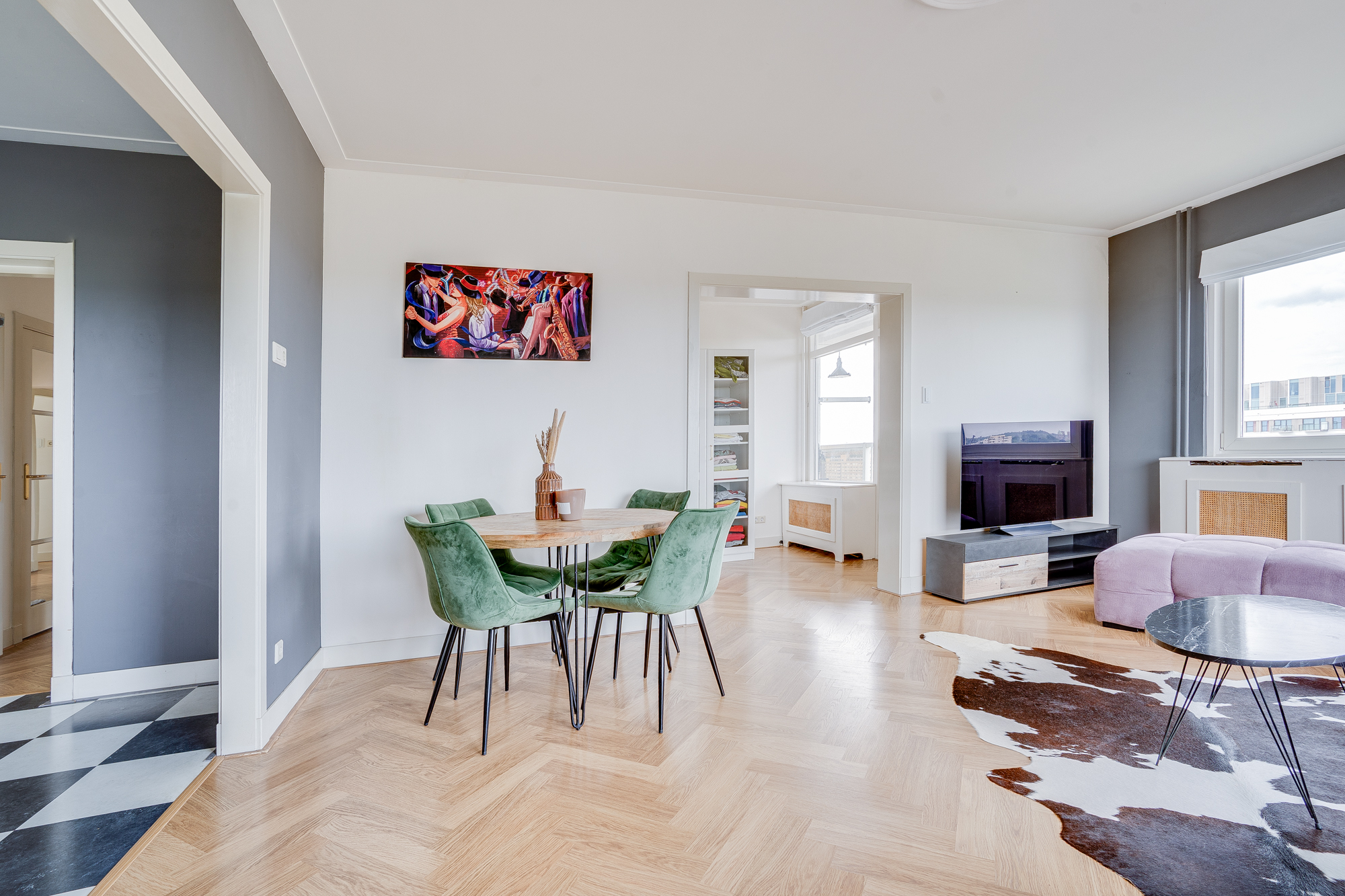 The generous, bright living room is situated at the front of the apartment and, thanks to large windows, offers a magnificent panoramic view. The ceiling height of 2.57 metres adds to the feeling of space and openness. There is a beautiful herringbone-patterned PVC floor that runs throughout the entire apartment!