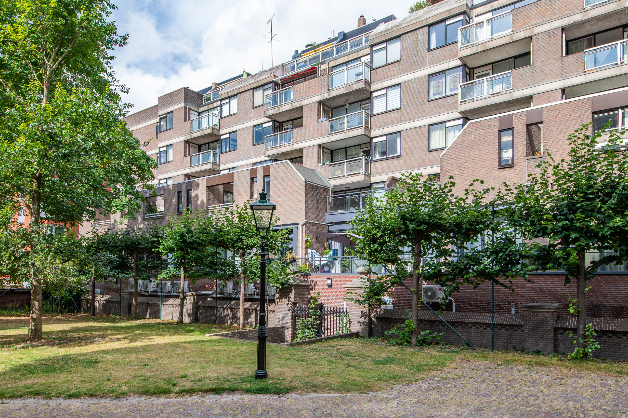 The bright living room opens onto a sunny balcony at the quiet rear of the building. The balcony offers an unobstructed view of the Nieuwe Kerk, surrounded by greenery, that is exceptional for the city center. A storage cupboard is located on the balcony.