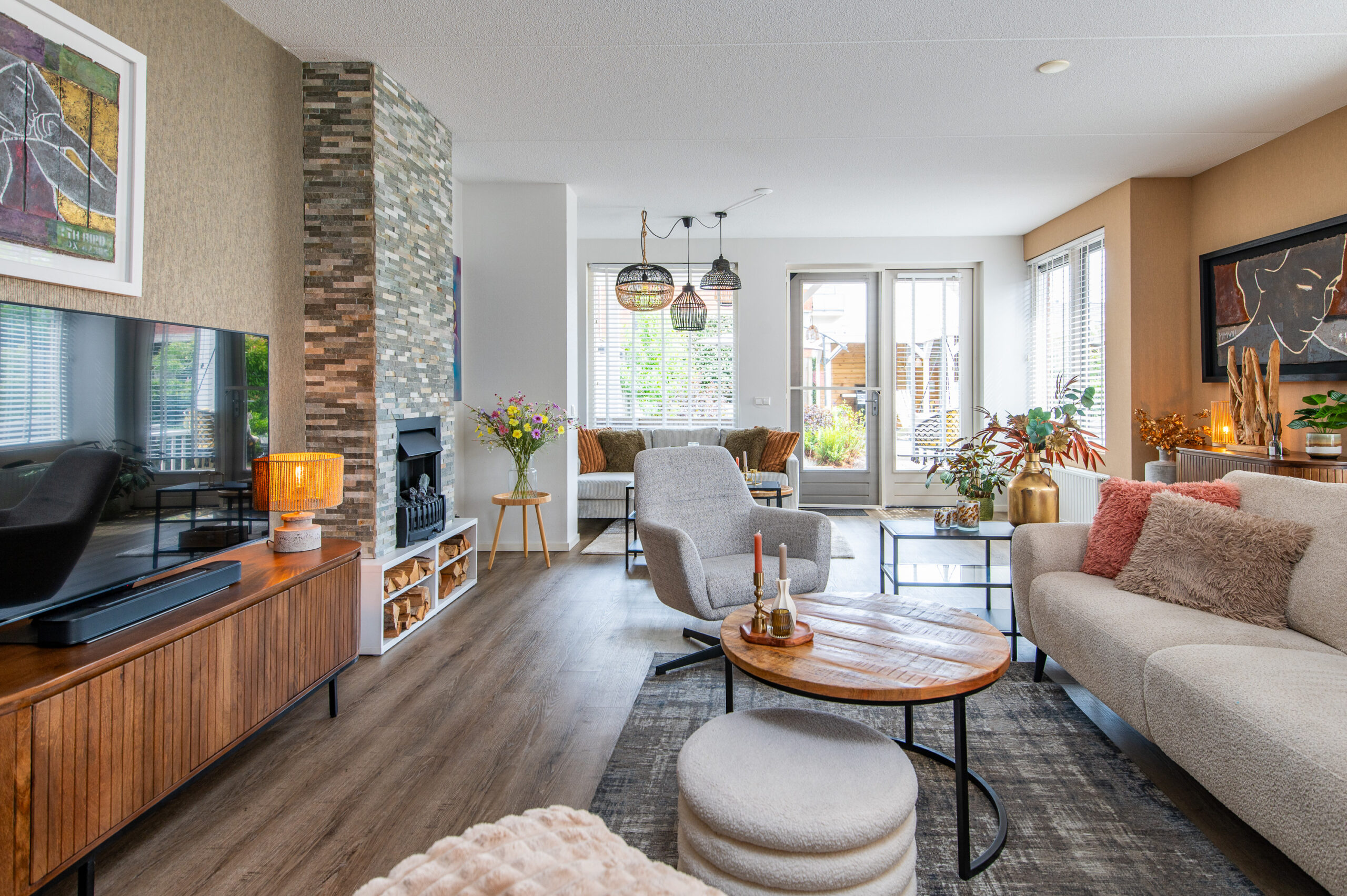 Hal met meterkast, trap naar eerste verdieping en toegang tot het moderne toilet met wandcloset en fonteintje. Ruime lichte woonkamer met sfeerhaard en zowel aan de zijkant als aan de achterkant een flinke uitbouw. Hierdoor is een prettige ruimte ontstaan die mogelijkheid biedt voor meerdere zitgedeelten.