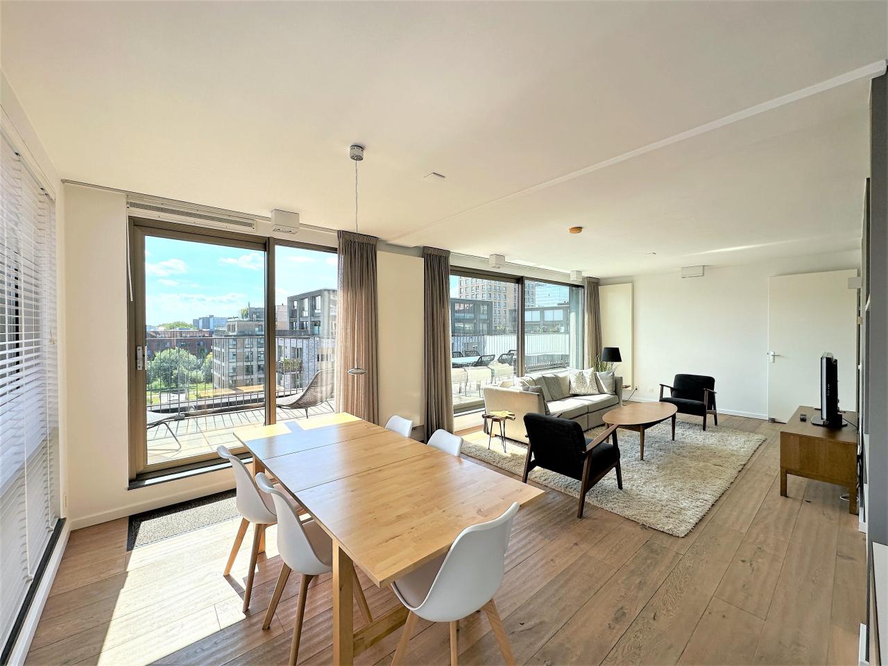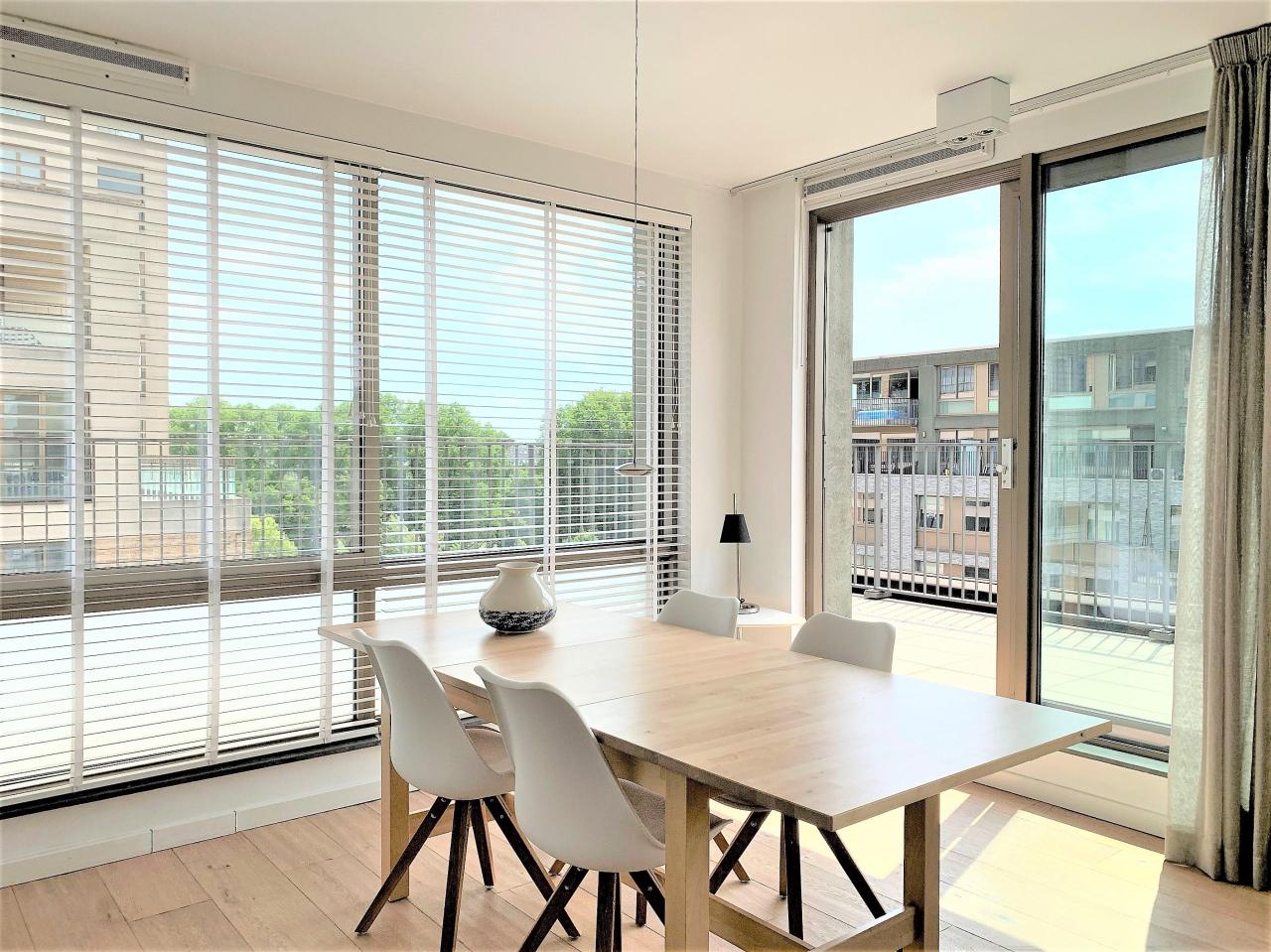 Indeling: Centrale entree op de begane grond met lift en trap naar de vijfde etage. Entree van het appartement met toegang tot de ruime hal. Zeer lichte woonkamer vanwege de grote raampartijen en schuifpuien naar het zonnige terras. Luxe open keuken voorzien van koelkast, vriezer, vaatwasser, combi-oven en inductiekookplaat met afzuiging. Drie zeer ruime slaapkamers. De moderne badkamer is voorzien van een ligbad, aparte douche, wastafel, toilet, bidet en design radiator. Apart tweede toilet met fonteintje. De woning beschikt over een ruim en zonnig terras (65m2). Een wasmachine- en drogeraansluiting is aanwezig in een aparte bergkast. Het gehele appartement is voorzien van een fraaie houten vloer.