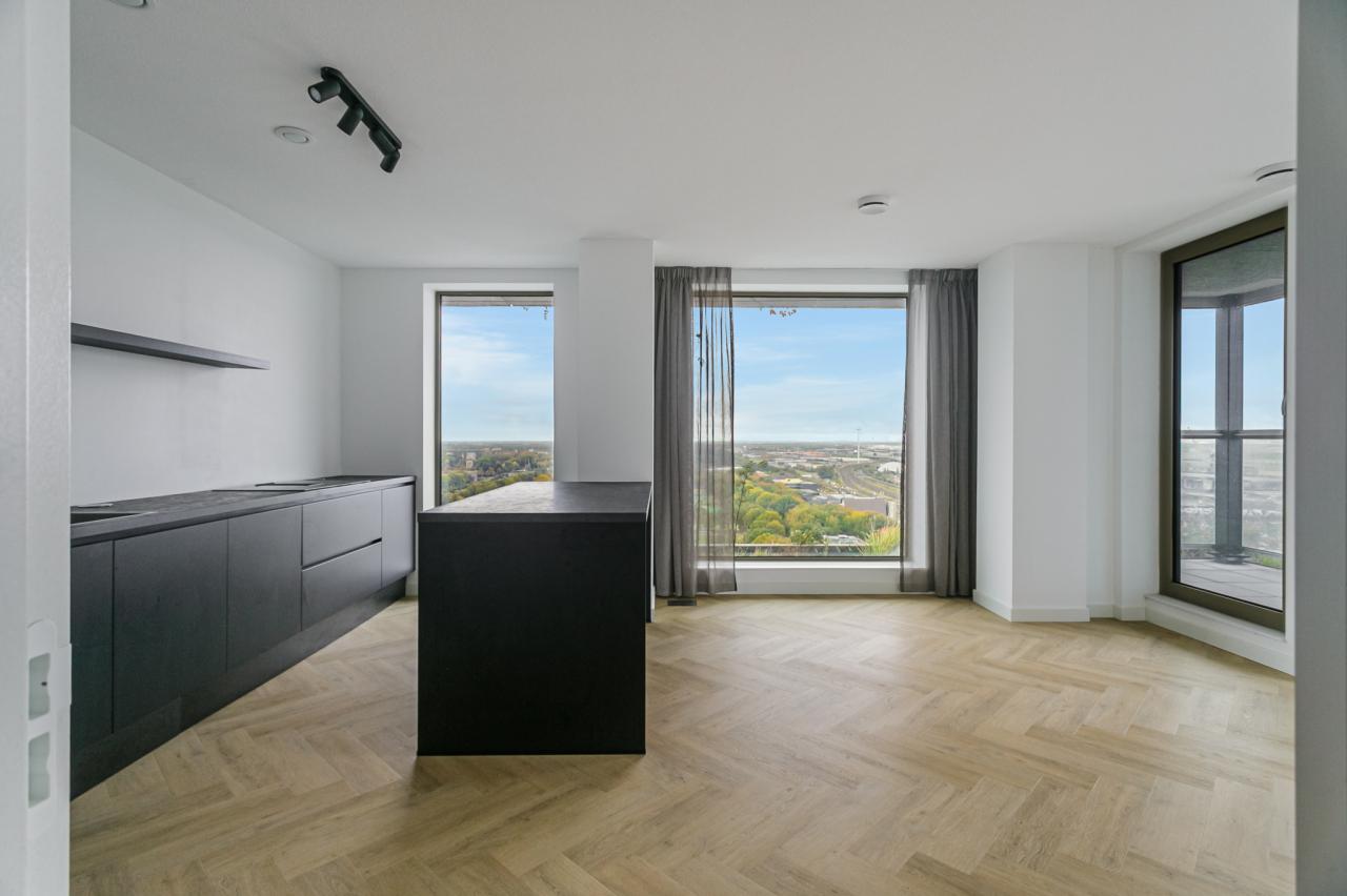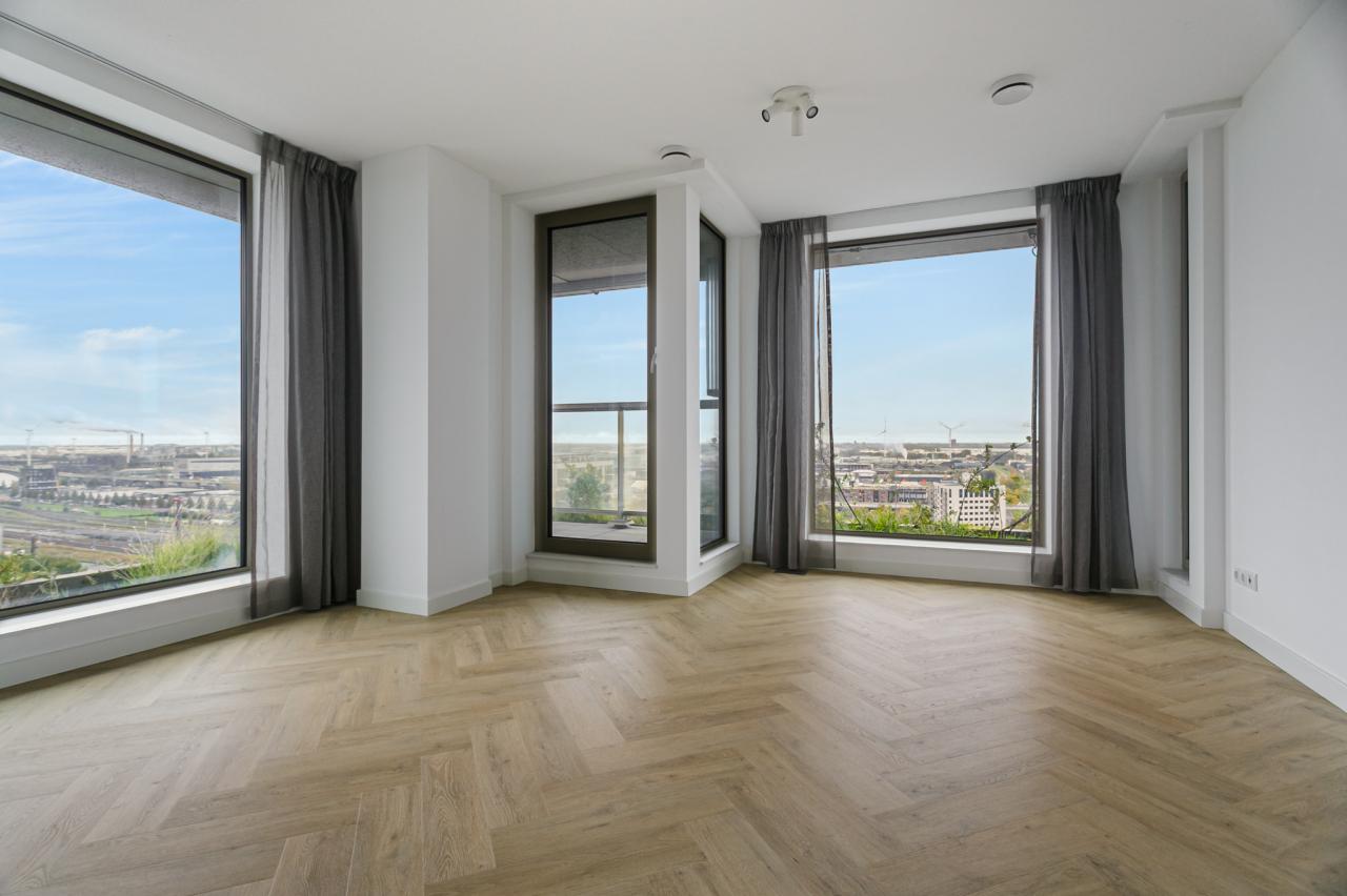 Indeling: Gezamenlijk entree met lift naar de 16e etage. Hal met toegang tot alle vertrekken van het appartement. Separaat toilet en een inpandige berging met aansluiting voor de wasmachine en droger. De woonkamer met luxe open keuken is royaal opgezet en dankzij de hoekligging bijzonder licht. De grote ramen bieden een panoramisch uitzicht over Amsterdam. De moderne open keuken is voorzien van hoogwaardige inbouwapparatuur. De baropstelling maakt het een ideale plek voor een ontbijt of een borrel. Aangrenzend aan de woonkamer bevindt zich een heerlijk balkon, waar je in alle rust kunt genieten van het uitzicht en de hoogte. Het appartement beschikt over twee slaapkamers: een ruime hoofdslaapkamer en een tweede kamer die perfect kan worden ingericht als werk-, logeer- of hobbykamer. De badkamer is modern vormgegeven en uitgerust met een inloopdouche en wastafel.