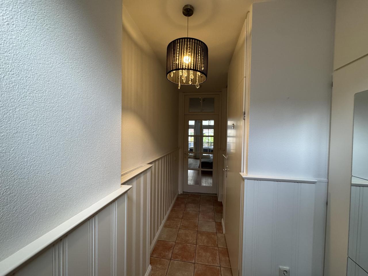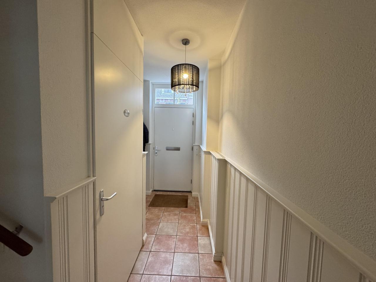 Bij binnenkomst in de woning komen we in de hal waar we rechts het gastentoilet met fonteintje vinden, daarnaast de trapopgang naar de eerste verdieping en aan het einde van de gang bevindt zich de woonkamer.