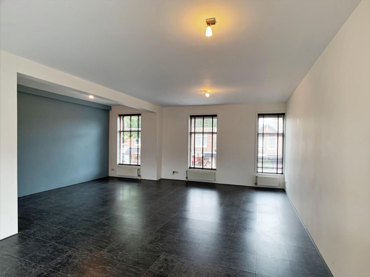 De woonkamer is voorzien van een donkere laminaat vloer en vanuit de grote ramen een leuk uitzicht over de Gijsbrecht van Amstelstraat.