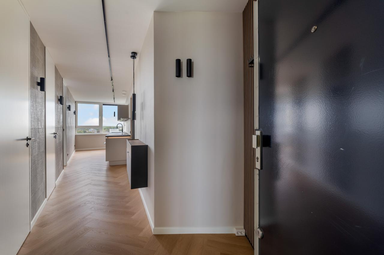 De woonkamer, keuken, badkamer en een ruime slaapkamer bevinden zich op de 11e etage. In de woonkamer, hal, keuken en slaapkamer is recent een prachtige visgraatvloer gelegd, die het interieur direct een frisse en moderne uitstraling geeft. Daarnaast zijn alle wanden opnieuw gestuukt en geschilderd, wat zorgt voor een strak en verzorgd geheel. De kamerhoge binnendeuren met verdekte scharnieren versterken het luxe gevoel, terwijl de elegante stalen taatsdeur naar de woonkamer een stijlvolle eyecatcher vormt.
