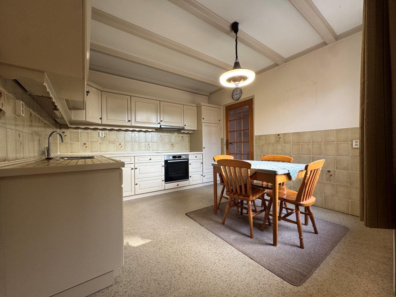 Bij binnenkomst in de hal met toiletruimte en garderobe toegang tot de woonkamer, woonkeuken en bijkeuken. Eenvoudige keuken v.v. koelkast, kookplaat, afzuigkap en oven. Bijkeuken met aansluitingen wasapparatuur, vaste kast en toegang tot de garage en tuin.