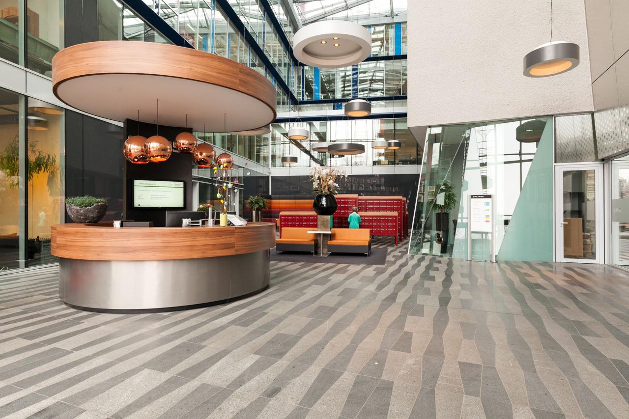 Receptie en servicebalie, video bellenplateau, brievenbussen en toegang tot de liftinstallatie.