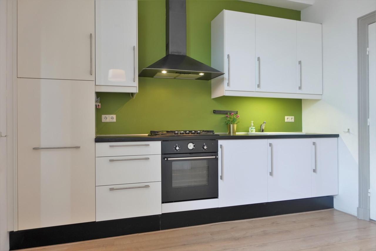 Via de overloop is de woonkamer met open keuken te bereiken. Aan de voorzijde van de woning is de zithoek gesitueerd, aan de achterzijde is het eetgedeelte. Via openslaande deuren is het op het westen gerichte balkon te bereiken. De open keuken is voorzien van alle gemakken, zoals: een koelkast, een vriezer, een oven, een vaatwasser, een gaskookplaat en een afzuigkap. De koel-vries combinatie en de vaatwasser staan in een bijkeuken waar ook de aansluitingen voor de wasmachine en wasdroger zijn. Op deze etage is tevens een aparte wc.