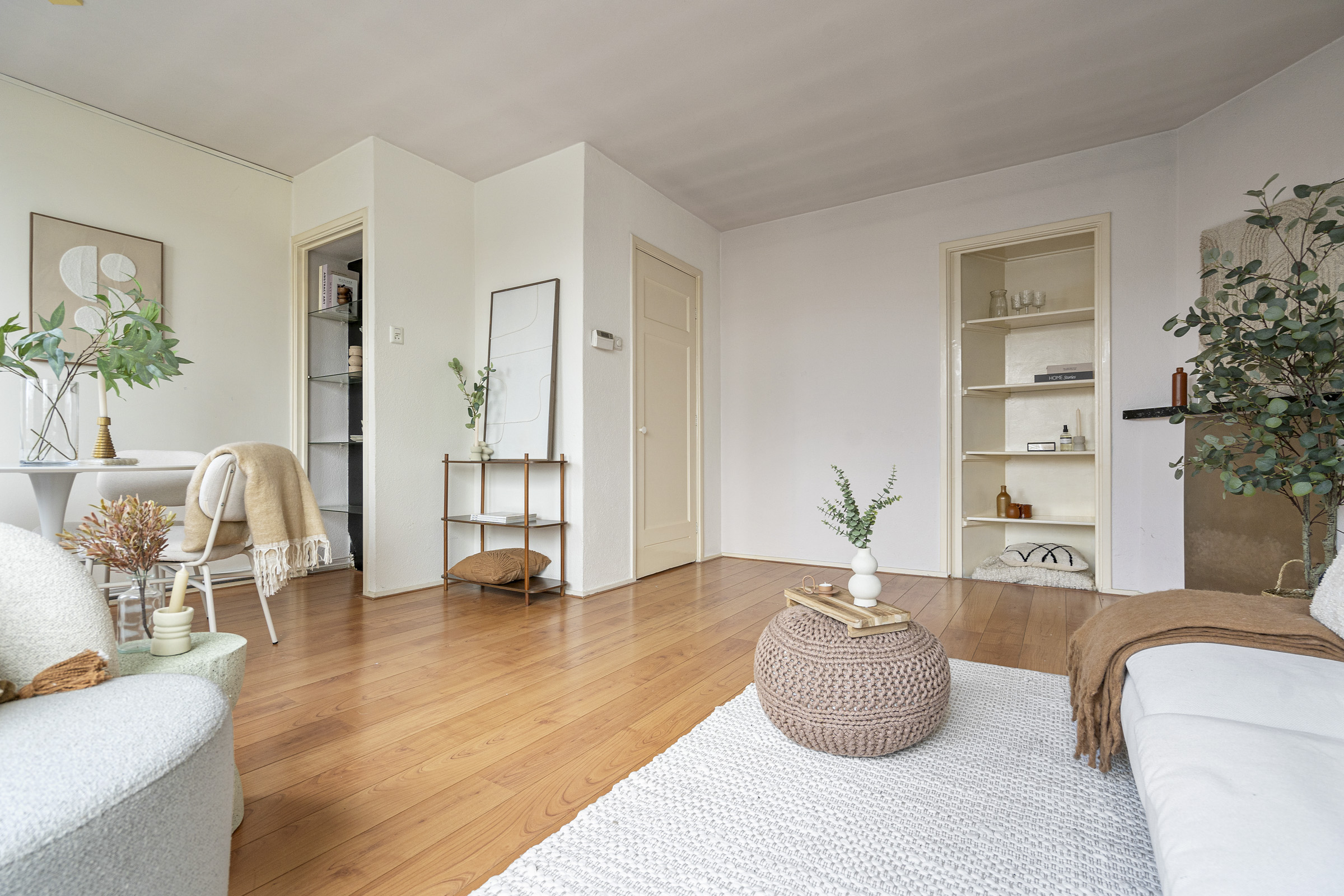 Door het hele appartement ligt een fraaie houten vloer, wat zorgt voor een warme, eigentijdse uitstraling.