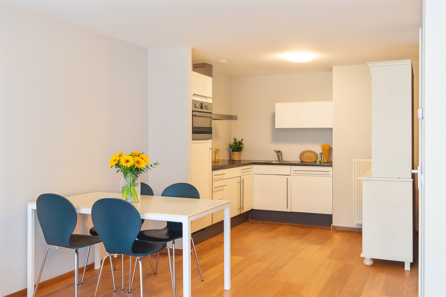 – Spacious living room with abundant daylight and a modern open-plan kitchen with built-in appliances;