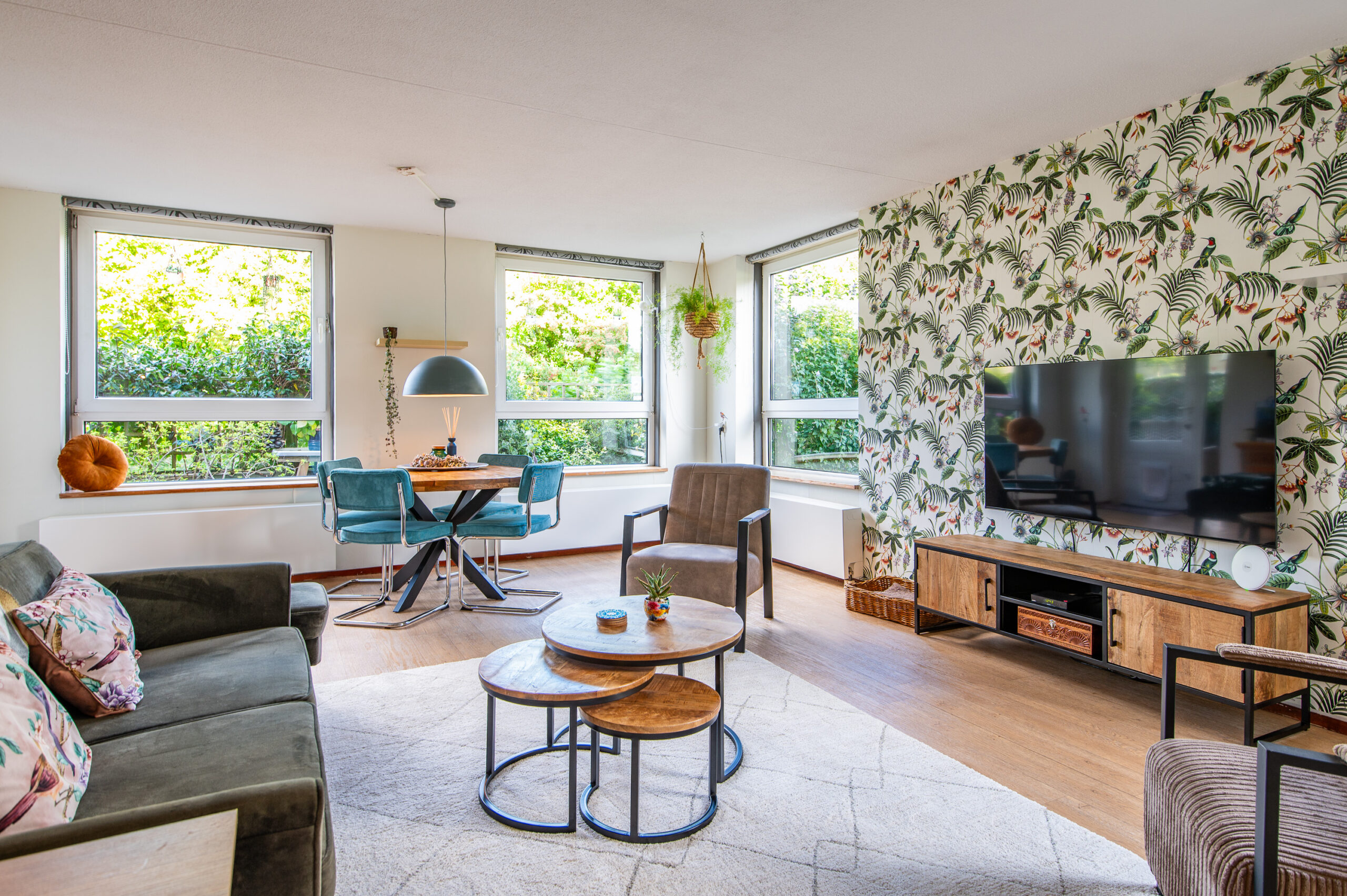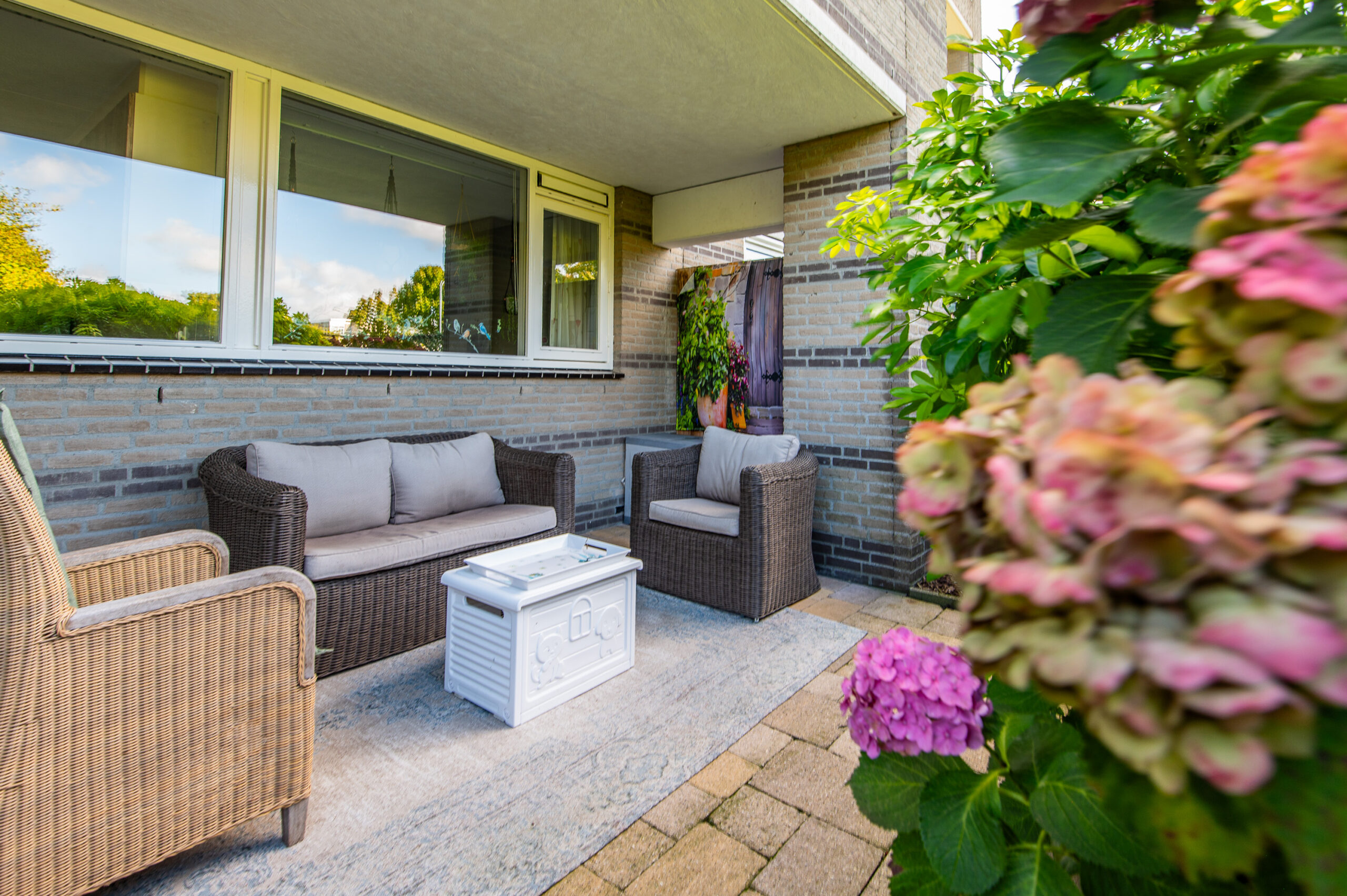 A well-maintained porch with automatic door openers, mailboxes, and a doorbell panel (video intercom). The apartment is accessed through a spacious hallway. The spacious and bright living room features many windows and a pleasant view of greenery on all sides. A door from the living room leads to the partially covered terrace and garden.