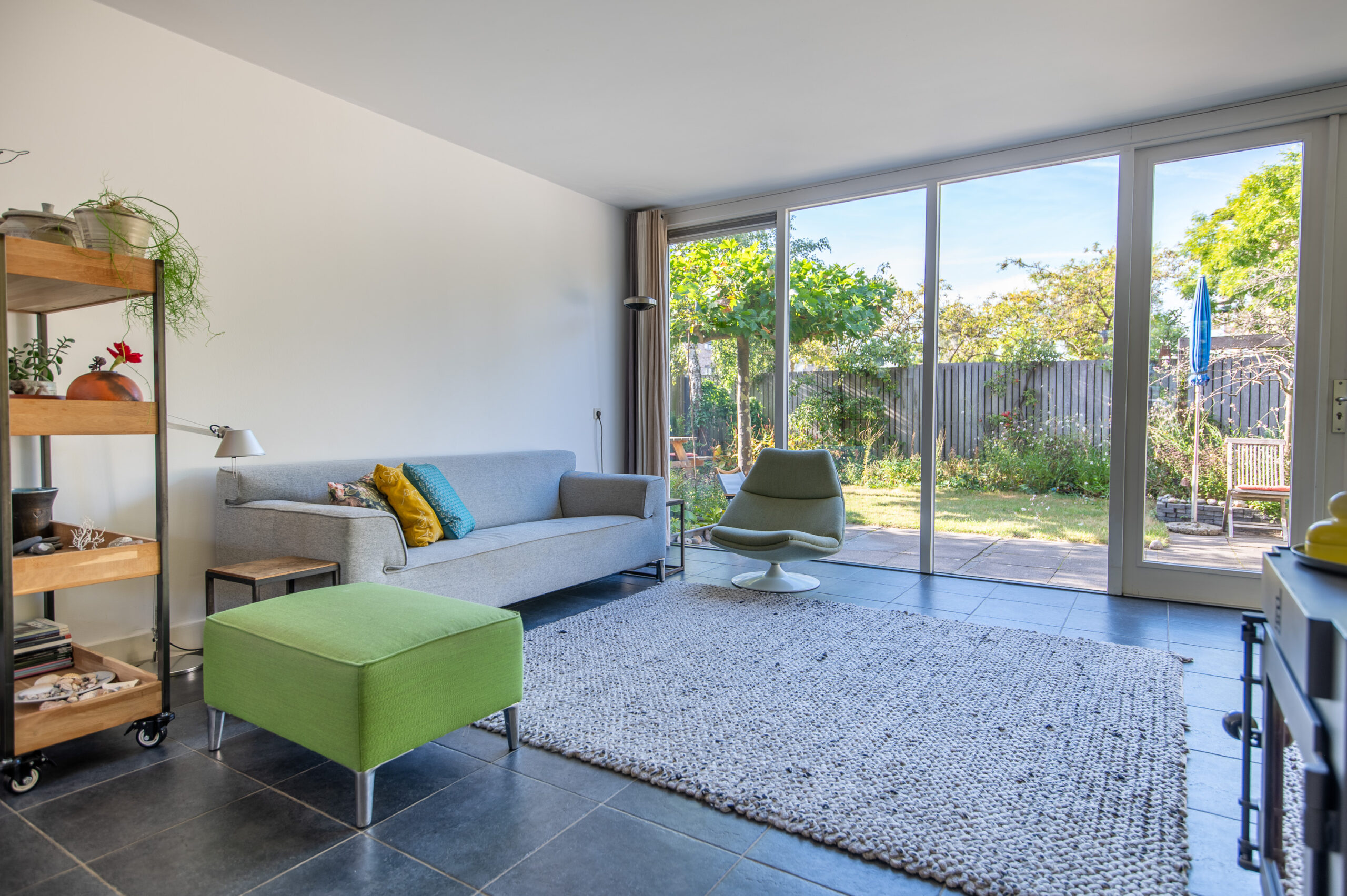 In de lichte tuingerichte woonkamer met open keuken vallen twee zaken direct op. De slim geplaatste scheidingswand waardoor er feitelijk twee zitgedeeltes zijn gecreëerd. En de achtergevel die vrijwel geheel uit glas bestaat. De groene achtertuin wordt op deze manier perfect bij de woonkamer getrokken. De woonkamer is verder voorzien van een efficiënte houtkachel. Open keuken met veel werk- en opbergruimte, een groot fornuis met dito oven, RVS afzuigschouw en losse koel-vriescombinatie. Zowel vanuit de keuken als vanuit de extra zithoek is toegang tot de trap naar de eerste verdieping.