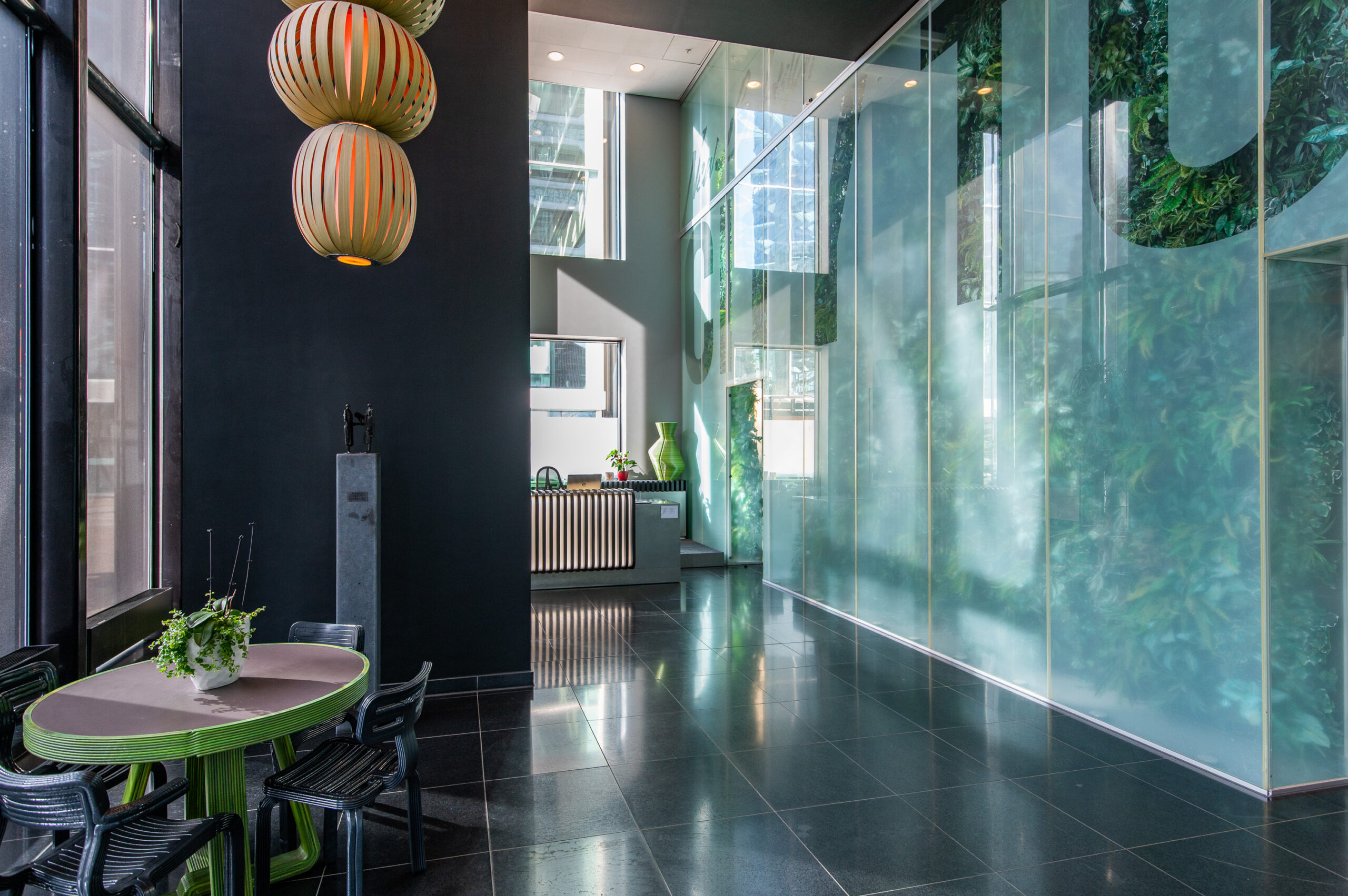 Luxe entree met brievenbussen en bellentableau (videofoon), de desk van de servicemanager en een keuze uit een van de liften naar de 37e verdieping.