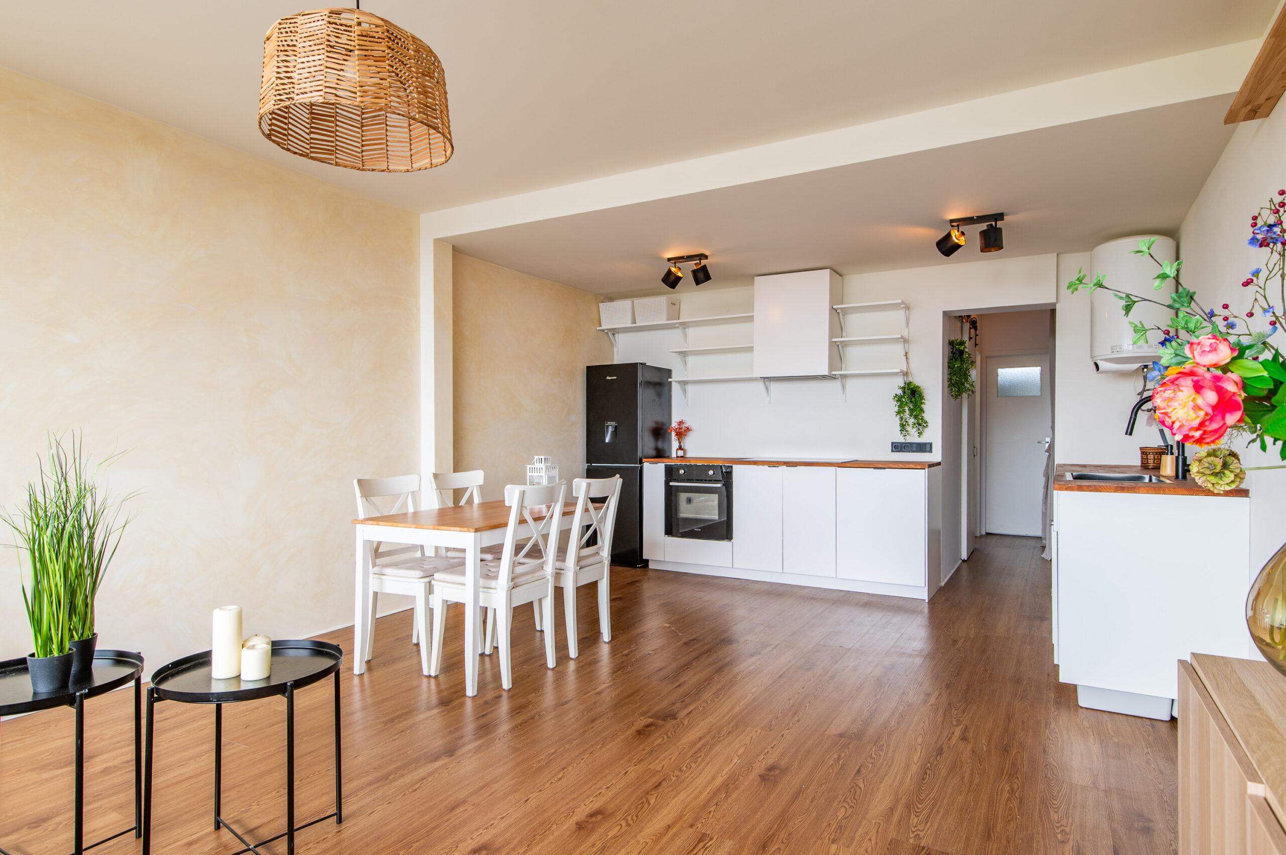 Ruime en lichte woonkamer met toegang tot het zonnige (Z-W) balkon met fenomenaal uitzicht richting Rotterdam, Europoort en de Maasvlakte. De open keuken is op een speelse manier geplaatst met twee werkgedeeltes als gevolg. Een kookgedeelte met inbouw inductiekookplaat, inbouw afzuigkap, vaatwasser, oven en koelkast. Het tegen de andere wand geplaatste gedeelte is voorzien van de spoelbak en biedt onder andere plaats aan de wasmachine en indien gewenst de wasdroger. De nieuwe elektrische boiler is in de hoek boven de keuken geplaatst. Er is geen gasaansluiting meer in het appartement.