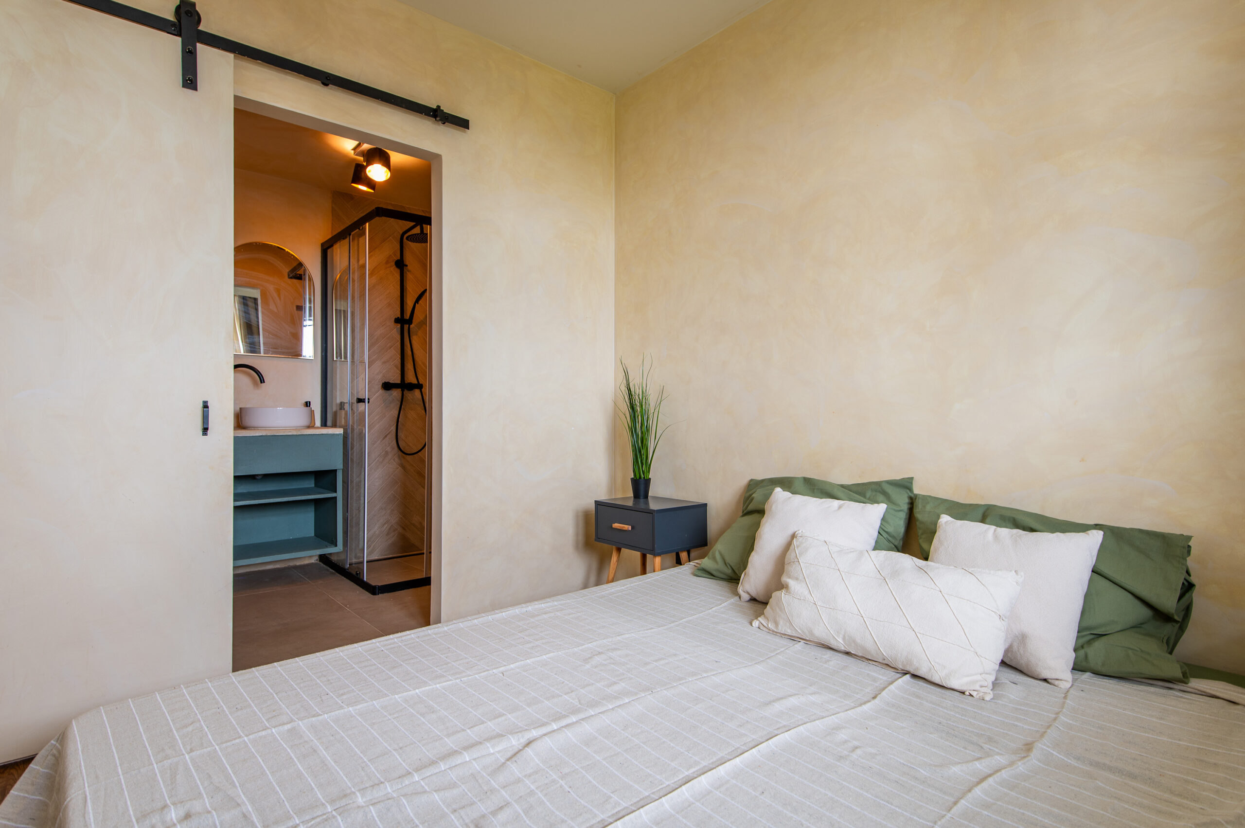 De slaapkamer is gelegen aan de achterzijde en biedt toegang tot de fraai gestileerde badkamer met inloopdouche en wastafel in meubel. Separaat toilet met fonteintje, bereikbaar vanuit de hal en afgewerkt met dezelfde smaakvolle materialen als de badkamer.