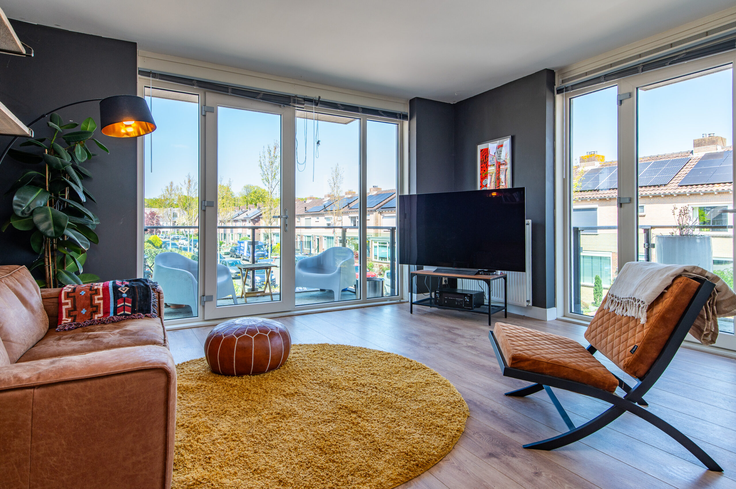 The living room with open kitchen is practically laid out and very light due to the large floor-to-ceiling windows on both sides of the room. Through these windows access to both balconies (one with morning and one with evening sun). The modern white kitchen is equipped with various built-in appliances, namely: fridge-freezer, dishwasher, combi-oven, gas hob and extractor hood.