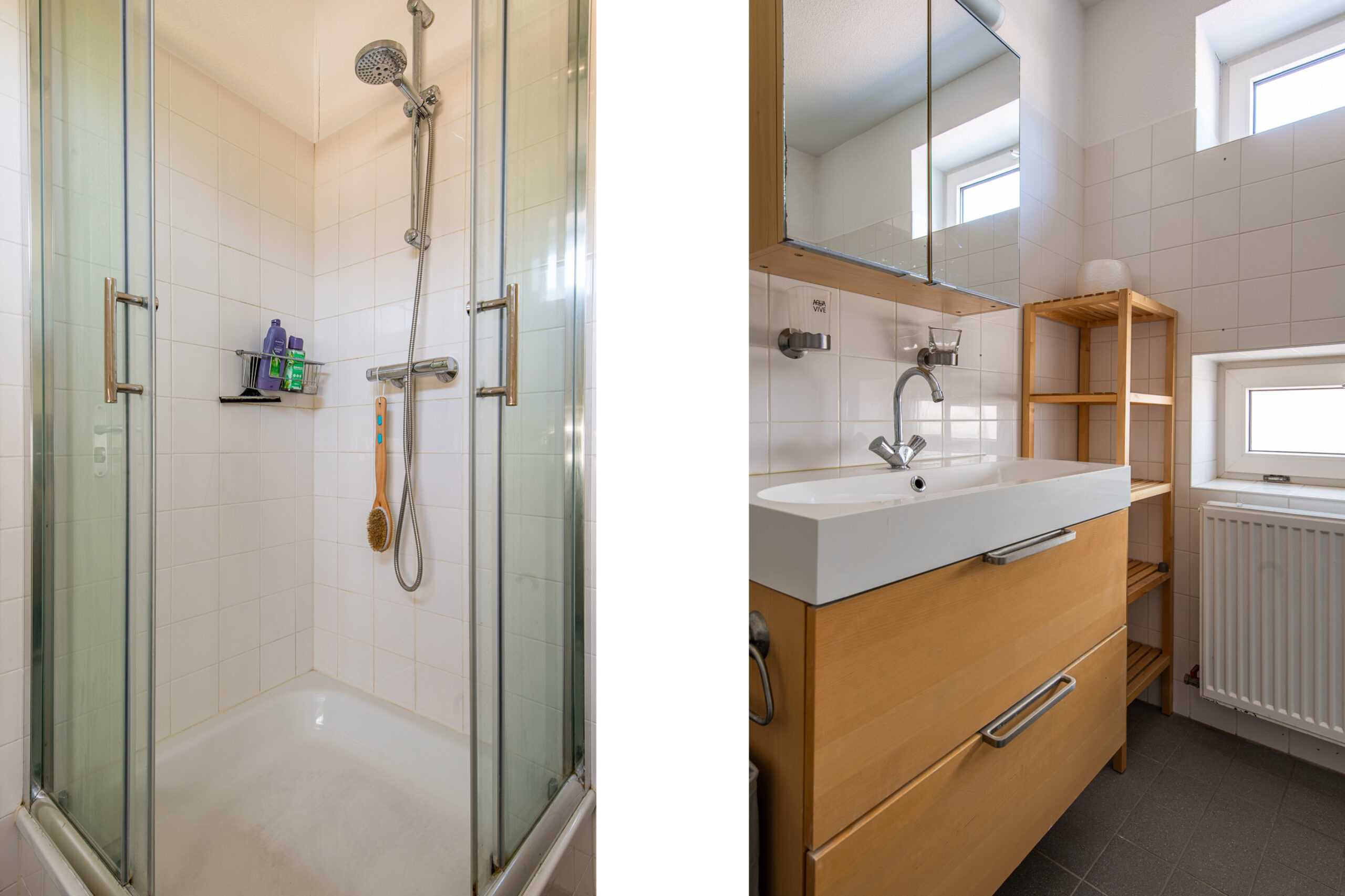 Furthermore, a spacious bedroom with en-suite bathroom. The bathroom (with daylight) is equipped with a shower cabin and a washbasin. The connections for the washing machine and dryer are also located here.