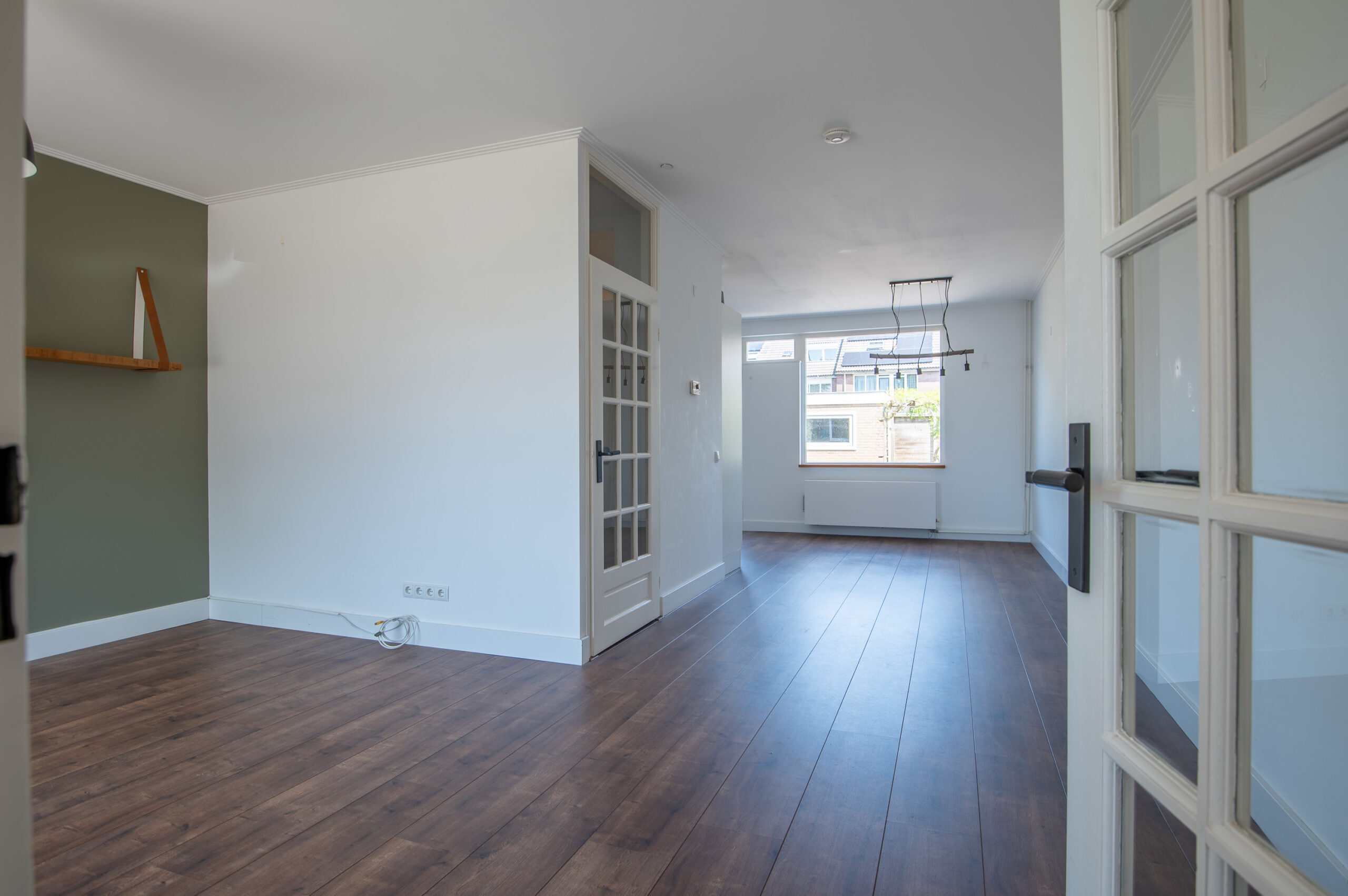 Lichte woonkamer met strakke wanden, een keurige laminaatvloer, hoge plinten en een moderne open keuken met toegang tot de diepe achtertuin. De keuken is voorzien van diverse inbouwapparatuur, te weten: vaatwasser, 5-pits gaskookplaat, combi-oven, RVS afzuigkap en koel-vriescombinatie. De diepe achtertuin is, mede door de lage omliggende bebouwing, erg zonnig en voorzien van een stenen berging en achteruitgang.