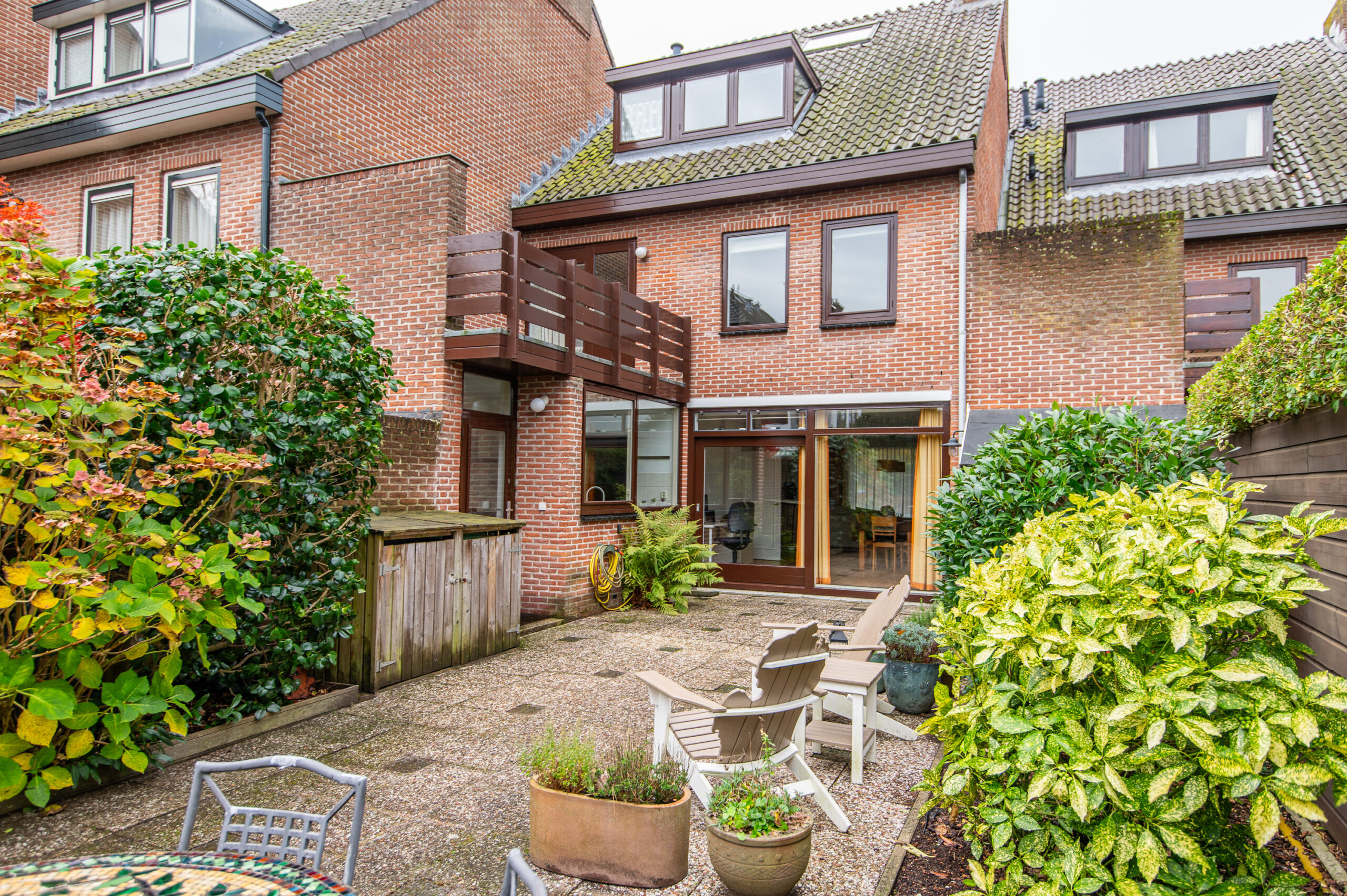 In de diepe achtertuin bevinden zich twee bergingen en een uitgang naar het achtergelegen binnenterrein waar de garage met capaciteit voor 1 auto zich bevindt.
